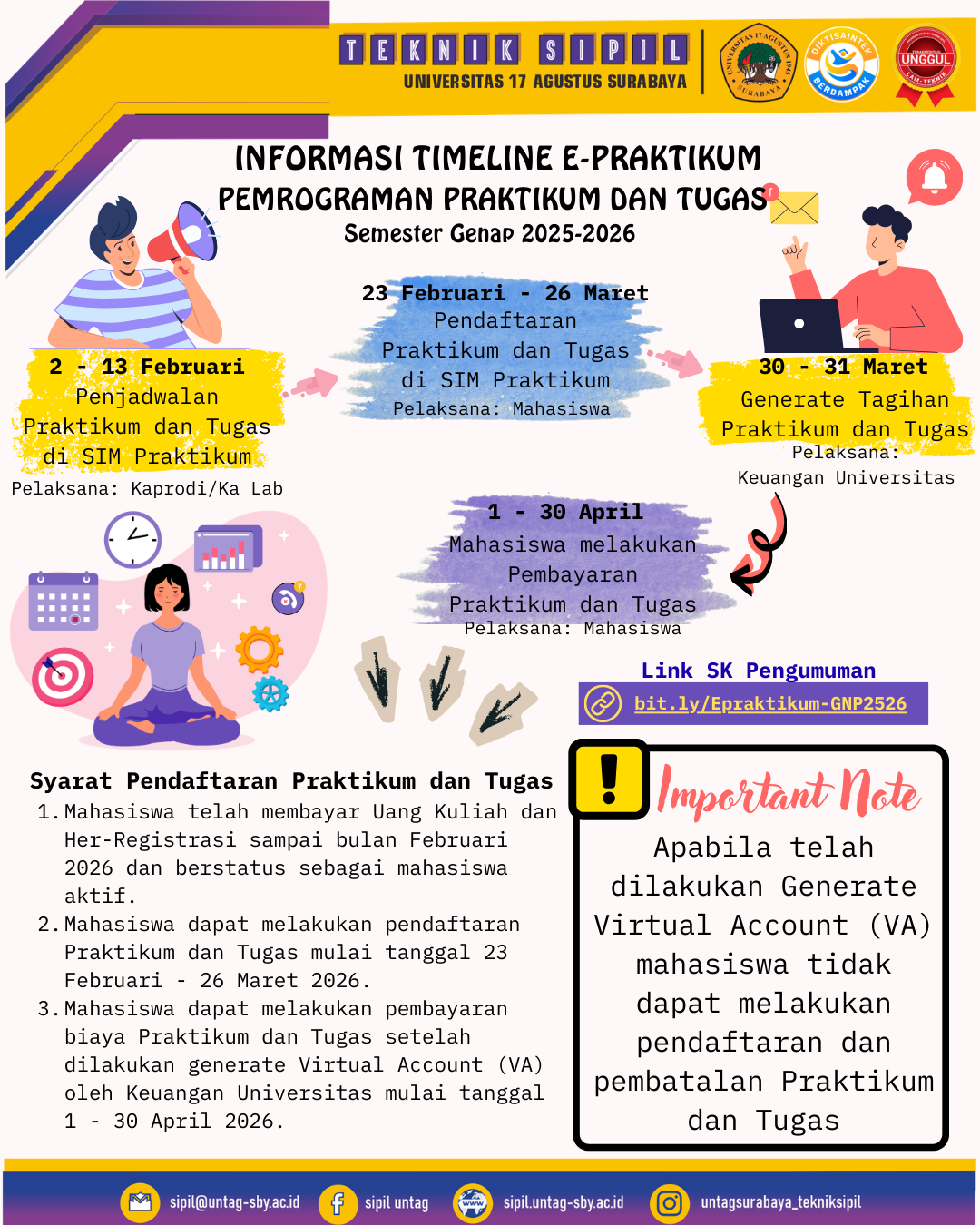 Sejarah Prodi Sipil tidak lepas dari sejarah Yayasan Perguruan 17 Agustus 1945. Sebagai badan penyelenggara UNTAG Surabaya yakni Yayasan Perguruan 17 Agustus 1945 Surabaya disingkat YPTA, berdiri pada tanggal 1 Nopember 1958 yang pada awalnya menyelenggarakan pendidikan /sekolah lanjutan tingkat atas yaitu SMA dan SGA. YPTA didirikan oleh beberapa orang yang berpandangan nasionalis yang menyadari kondisi masyarakat dan bangsa Indonesia pada saat itu yang baru terlepas dari negara penjajah. Para...