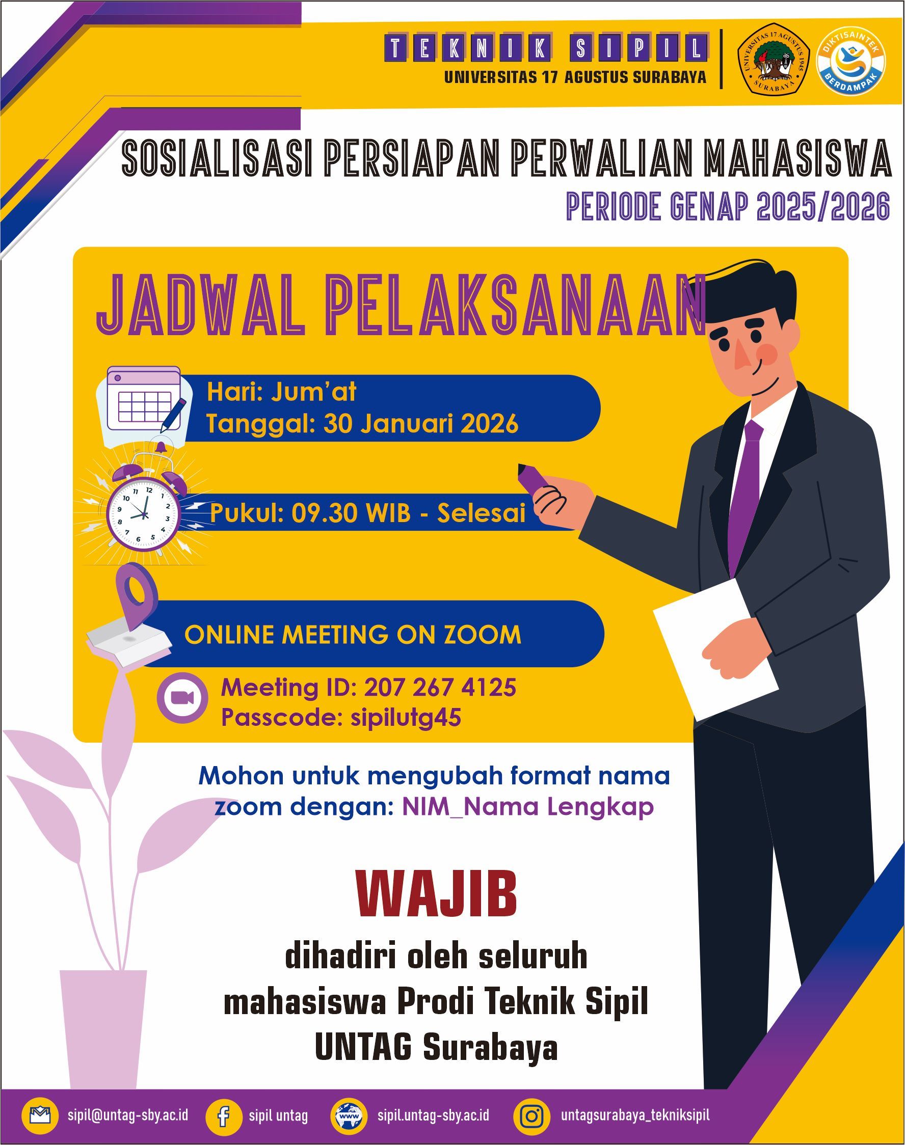 Program Studi Teknik Sipil Universitas 17 Agustus 1945 Surabaya menginformasikan kepada seluruh mahasiswa bahwa akan dilaksanakan kegiatan Sosialisasi Persiapan Perwalian Mahasiswa Periode Genap 2025/2026, yang bersifat wajib untuk diikuti.