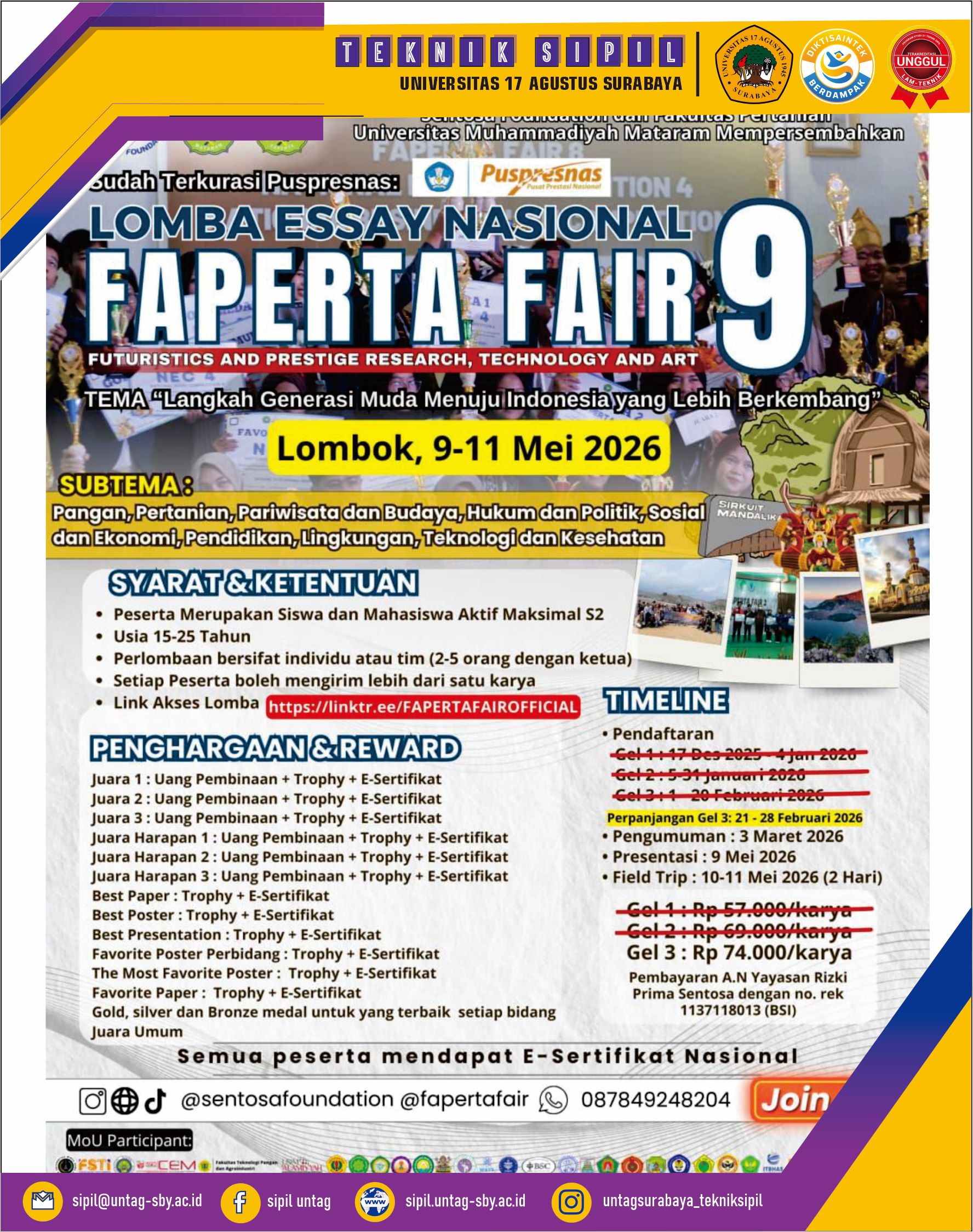 Lomba Essay Nasional Faperta Fair 9 diadakan di Lombok, 9–11 Mei 2026